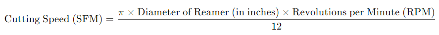 Ang bilis ng pagputol, o bilis ng ibabaw, ay tumutukoy sa bilis kung saan gumagalaw ang cutting edge ng reamer sa workpiece. Karaniwan itong sinusukat sa surface feet per minute (SFM) o metro kada minuto (m/min). Upang kalkulahin ang tamang bilis ng pagputol para sa isang reamer, gamitin ang sumusunod na formula: